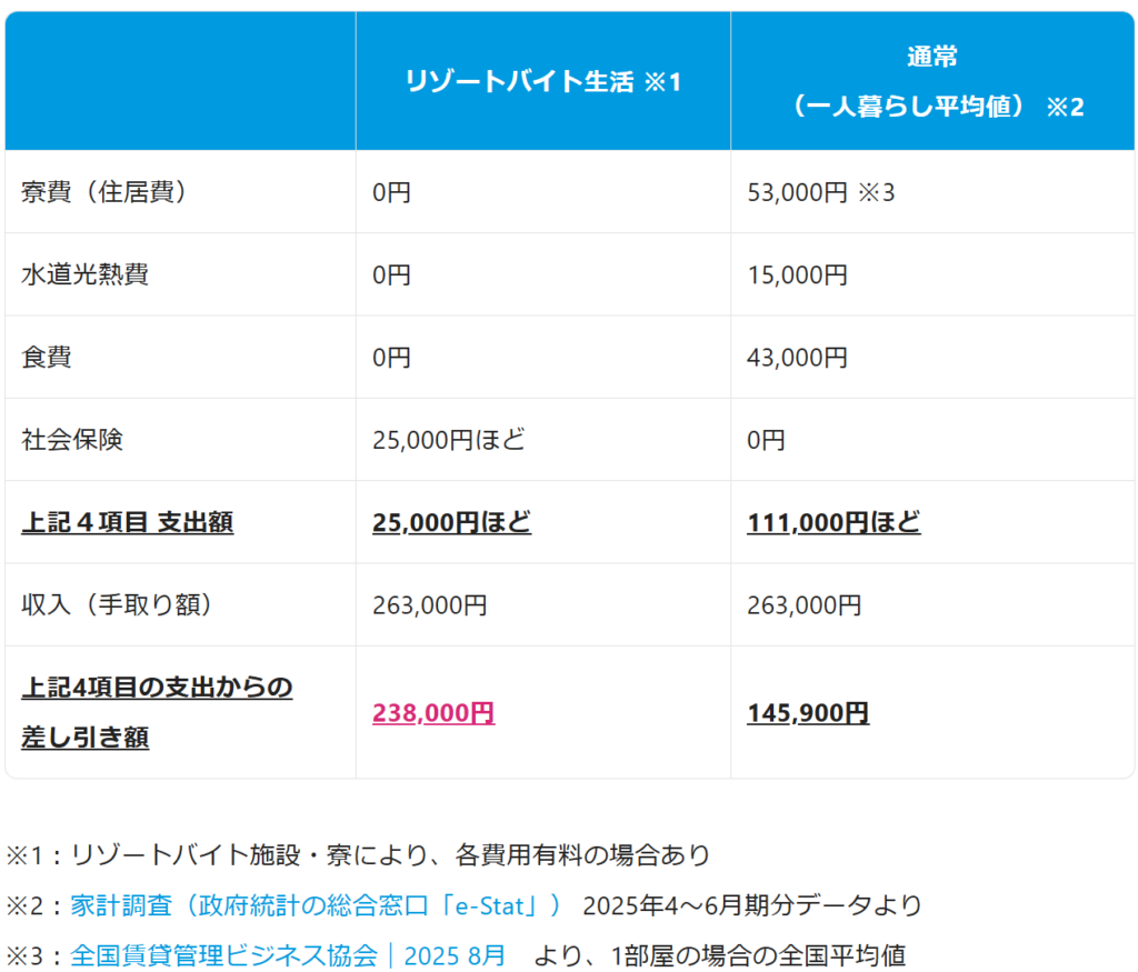 リゾートバイトでは、寮費・水道光熱費無料の求人が多数あります。